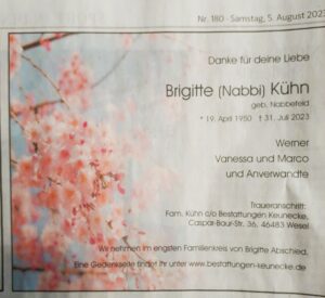 Wir trauern um unsere beliebte Kollegin Brigitte Kühn, die am 31.07.2023 nach langer Krankheit verstorben ist.